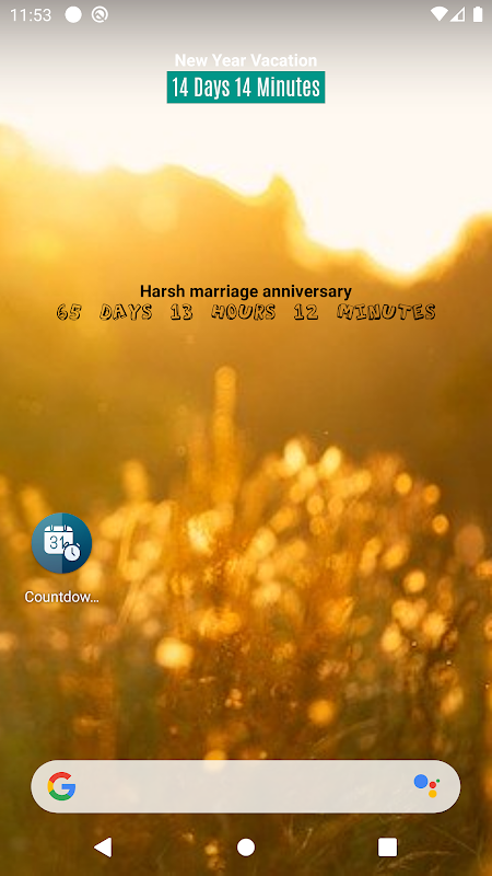 Thêm bất kỳ số tiện ích con nào trên màn hình chính để bạn có thể xem những ngày còn lại cho tất cả các sự kiện đặc biệt của mình. Như: đếm ngược sinh nhật, đếm ngược kỳ nghỉ chrismas, đếm ngược kỷ niệm. Chọn bất kỳ ngày nào và theo dõi các ngày cho đến những sự kiện đặc biệt trong cuộc đời bạn.