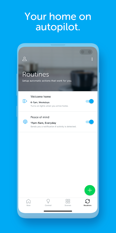Ngôi nhà của bạn chỉ cách một cú chạm. Bỏ nhà đi vội vã? Khóa cửa của bạn trong vài giây ở mọi nơi, mọi lúc. Dễ dàng điều khiển đèn, ổ cắm, bộ điều nhiệt, khóa và hơn thế nữa. Đặt một cảnh trong vài giây - đêm chiếu phim tự phát của bạn đã sẵn sàng trước khi bạn có thể bật Netflix. Tận hưởng một ngôi nhà tự động phản ứng với các quy trình của bạn. Các thói quen là một cách tuyệt vời để tiết kiệm năng lượng khi bạn không ở nhà hoặc bật đèn khi bạn thức vào các ngày trong tuần.
