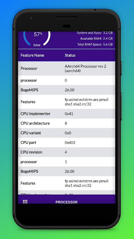-Processor : Processor, BogoMIPS, Features, CPU Implementer, CPU part, CPU variant;