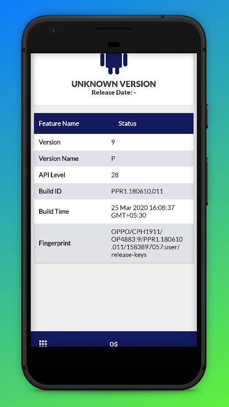 - OS information : Android version, API Level, Build ID, Build Time, Fingerprint;