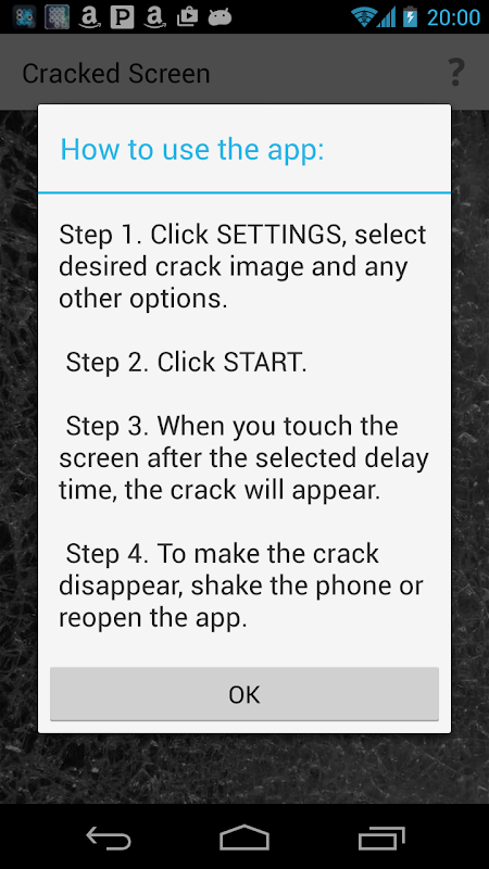 Đánh lừa tất cả mọi người và nói với họ rằng bạn bị nứt màn hình điện thoại di động của bạn. Thưởng thức một trận cười khi bạn nói dối với mọi người về cách bạn bỏ điện thoại của bạn. Bạn vẫn có thể sử dụng điện thoại di động của bạn trong khi các vết nứt trên đầu trang. Hình ảnh rất thực tế
