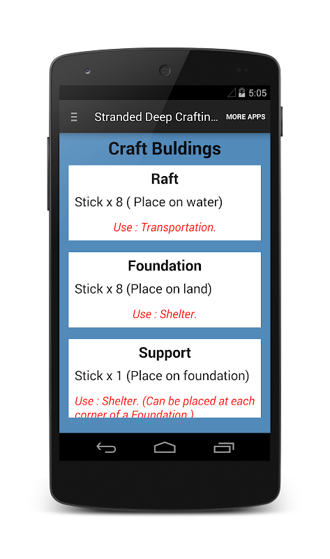The app is a must have companion for your journey in the Stranded Deep game. This will help you with the game basics, crafting things and buildings, find items and some handy tips.
