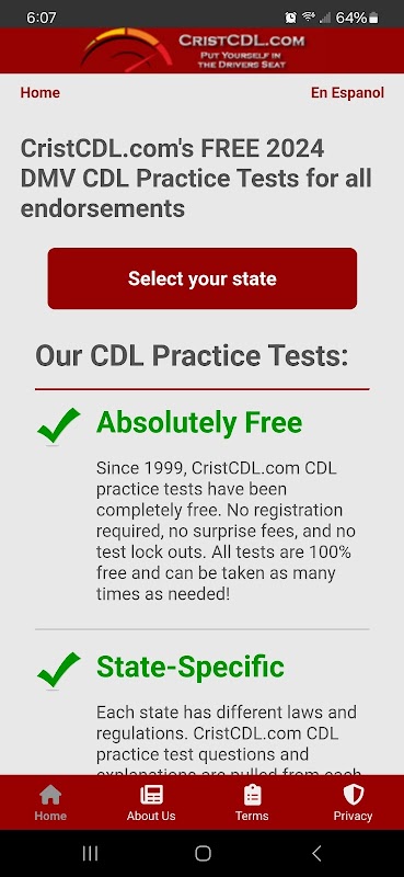 Các bài kiểm tra thực hành của chúng tôi mang tính cụ thể theo từng tiểu bang và bao gồm Kiến thức chung, Phanh hơi, Tổ hợp, Xe chở dầu, Xe đôi và Bộ ba, Vật liệu nguy hiểm, Xe buýt trường học, Hành khách, đồng thời có các bài kiểm tra và video để Kiểm tra trước chuyến đi. Mỗi bài kiểm tra cung cấp phản hồi ngay lập tức về câu trả lời của bạn, cho biết bạn trả lời đúng hay sai kèm theo lời giải thích cho câu trả lời đúng và nên được sử dụng cùng với hướng dẫn sử dụng trạng thái hiện tại mà chúng tôi đã đưa vào ứng dụng để tải xuống.