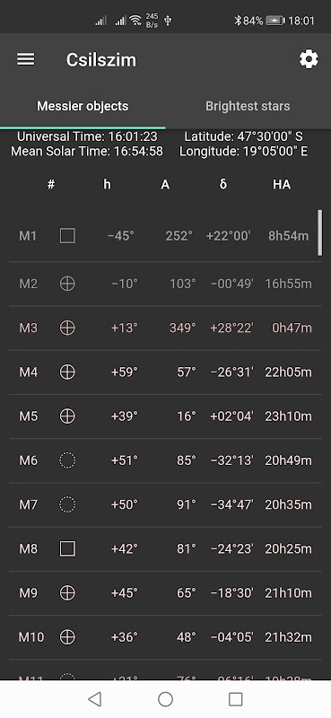 Điều này hiển thị các vị trí thiên thể hiện tại của các vật thể Messier và các ngôi sao sáng trong thời gian thực. Hiển thị trong hệ tọa độ xích đạo và mặt đất. Các đối tượng ở độ cao lớn được hiển thị bằng màu sáng, các đối tượng ở độ cao thấp và các đối tượng bên dưới đường chân trời được hiển thị bằng màu tối.