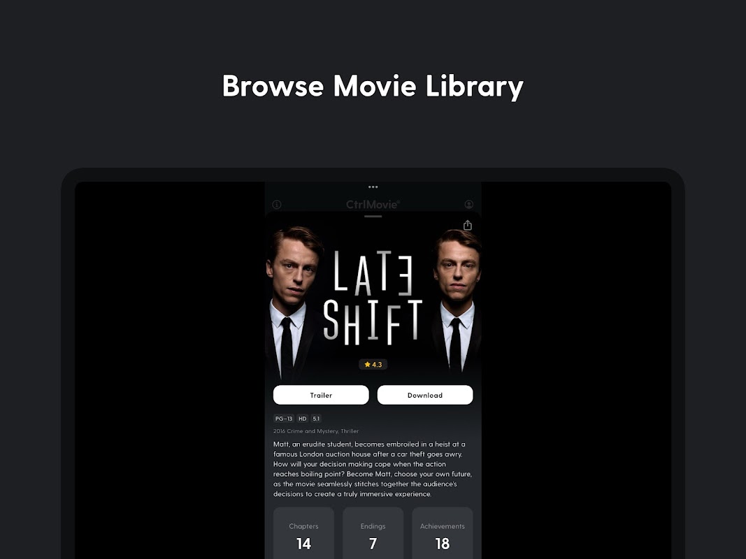 Ứng dụng CtrlMovie cho phép bạn đưa ra quyết định cho nhân vật chính tại các buổi chiếu phim truyện tương tác CtrlMovie. Có thể là tại rạp chiếu phim địa phương của bạn hoặc tại nhà trên nền tảng trò chơi yêu thích của bạn, bạn và bạn bè của bạn cùng kiểm soát câu chuyện của bộ phim.