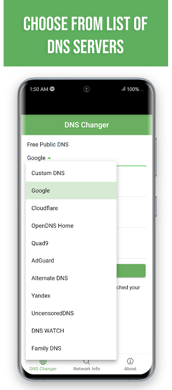 DNS tùy chỉnh là một công cụ thay đổi DNS dễ sử dụng, hỗ trợ cả IPv4 và IPv6. Nó hoạt động trên cả mạng Wi-Fi và di động và bạn không cần phải root điện thoại của mình.