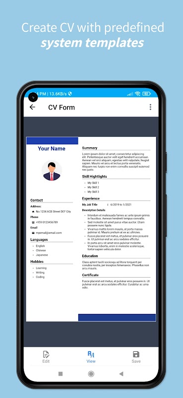 CV Creator để tạo CV và Sơ yếu lý lịch với các mẫu được xác định trước và mẫu tùy chỉnh.