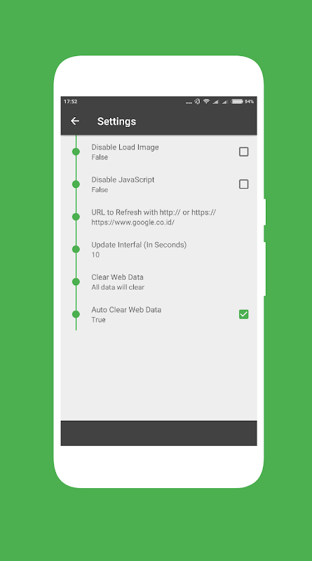 ứng dụng đơn giản để tự làm mới webview với thời gian định kỳ. Để thay đổi url bằng địa chỉ url nhấp chuột vào thanh công cụ hoặc trong cài đặt. Bạn có thể vô hiệu hóa hình ảnh tải và javascript.