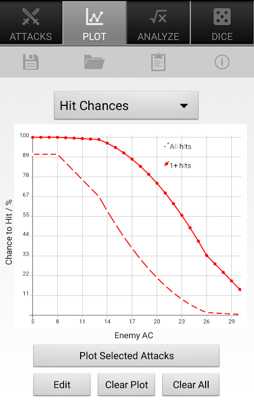 Ver. 1.8: Hỗ trợ cho các quy tắc của Ấn bản thứ 5 và các buff ưu tiên / lợi thế. Giờ đây, bản phân phối cuộn có thể được đánh giá trong hộp thoại Số liệu thống kê để có cơ hội ghi nhiều hơn / ít hơn so với cuộn xúc xắc đã cho. Tùy chỉnh: bây giờ có thể tắt tùy chọn "Sử dụng AC mục tiêu" từ Cài đặt. Đã thêm tùy chọn để hiển thị cơ hội cho đường cong "tất cả các cuộc tấn công bỏ lỡ". Sửa lỗi nhỏ. Tôi vẫn còn khá mới với phiên bản thứ 5. quy tắc, vì vậy tất cả các thông tin phản hồi là rất hoan nghênh!