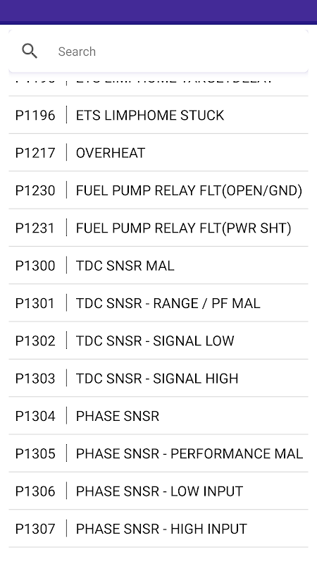 Cực kỳ thân thiện với người dùng! Bạn thậm chí không cần phải chọn một mô hình xe. Chỉ cần nhập mã sự cố của bạn sẽ khiến ứng dụng hiển thị tất cả các giải thích được hỗ trợ. Không cần kết nối Internet và bạn sẽ không còn phải mất hàng giờ nhìn vào đèn kiểm tra động cơ để tìm mô tả của một mã. Quá trình tra cứu mã lỗi Daewoo Diagnostic Trouble Code (DTC) chưa bao giờ đơn giản đến thế.