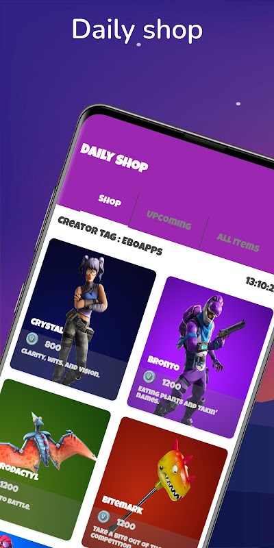 Ứng dụng này được tạo ra để kiểm tra vòng quay cửa hàng vật phẩm hiện tại cho trò chơi Battle Royale ngay từ điện thoại di động của bạn, không cần phải mở trò chơi để kiểm tra cửa hàng vật phẩm hàng ngày ngay hôm nay. Ứng dụng này sẽ hiển thị tất cả mỹ phẩm trong cửa hàng ngày hôm nay bao gồm Mặt hàng nổi bật và Mặt hàng hàng ngày. Dữ liệu được cập nhật hàng ngày và bạn có thể xem trực tiếp cửa hàng hàng ngày ngay khi cửa hàng cập nhật.!