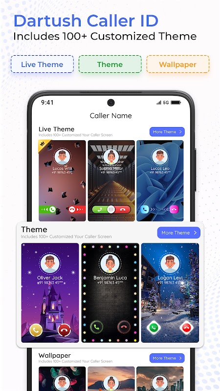 Dartush cung cấp màn hình Kiểu tùy chỉnh cho các cuộc gọi đến và đi, đồng thời cung cấp các chủ đề cuộc gọi tuyệt vời, ID người gọi, trải nghiệm chất lượng cao và các cài đặt điện thoại được cá nhân hóa khác.