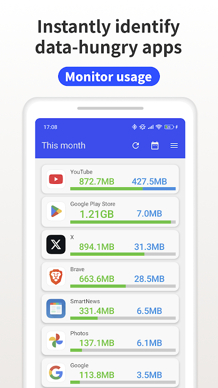 ・Đo lường Chính xác – Nhận số liệu chính xác về mức sử dụng dữ liệu di động và Wi-Fi. Đặt khoảng thời gian tùy chỉnh để theo dõi mức tiêu thụ hàng ngày, hàng tuần hoặc hàng tháng. Mức sử dụng Wi-Fi được sắp xếp thuận tiện theo mạng để hiển thị đầy đủ.