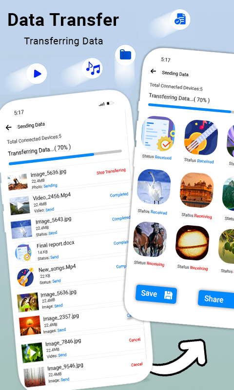 Share Files for free with Phone Transfer app to quick Share your Files🔗. Android File Transfer is a convenient tool for your data to Send Anywhere. Copy Data to another device without any Hesitation with Data Share App.