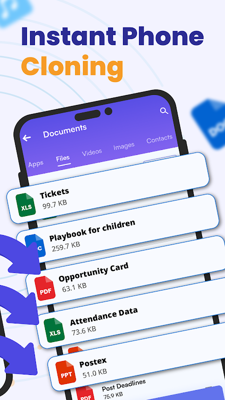 Nhân bản điện thoại miễn phí không rắc rối mà không mất dữ liệu. Tự tin chuyển dữ liệu của bạn một cách an toàn. Với ứng dụng chia sẻ thông minh của chúng tôi, bạn có thể dễ dàng di chuyển danh bạ, SMS, ảnh, nhạc, video và ứng dụng từ điện thoại cũ sang điện thoại mới mà không có nguy cơ mất dữ liệu. Bạn thậm chí có thể di chuyển tệp sang thiết bị khác mà không cần cài đặt ứng dụng trên đó.