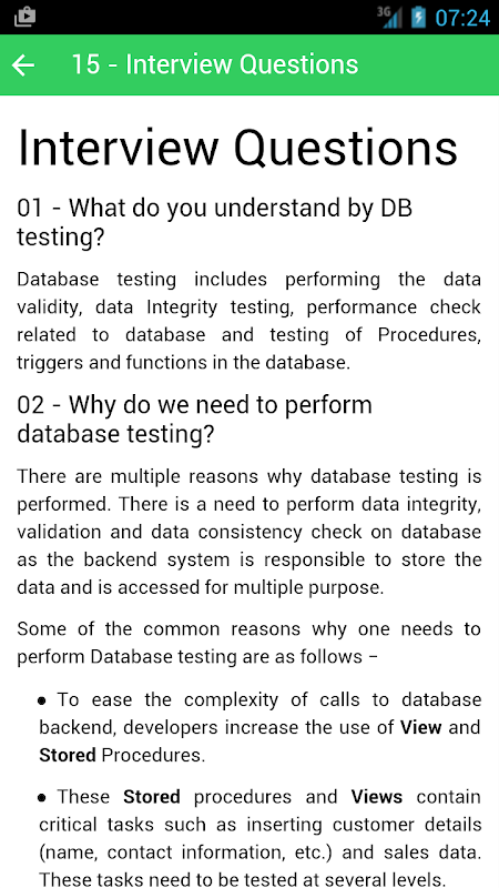 Ứng dụng này cũng có chứa một tập hợp các câu hỏi phỏng vấn về việc kiểm tra cơ sở dữ liệu. Nó có thể giúp bạn về cuộc phỏng vấn của bạn khi bạn áp dụng cho một công việc mới liên quan đến kiểm tra cơ sở dữ liệu.