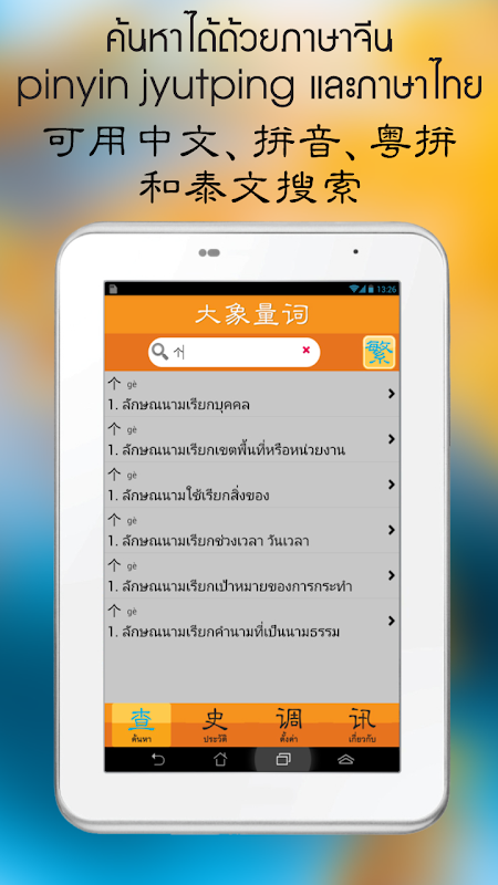 โปรแกรมยอดนิยม大象量词รวบรวม คำลักษณนามจีน ไทย มากกว่า 2,000 รายการ แสดงอักษรจีนแบบย่อ Chinese(Simplified) , ภาษาจีนแบบดั้งเดิม Chinese(Traditional) , pinyin and jyutping มีหน้าประวัติของคำที่ได้ค้นหาแล้ว อ่านออกได้ 3 ภาษา คือ เสียงไทย เสียงจีนกลาง (Mandarin) และเสียงจีนกวางตุ้ง (Cantonese) จากเจ้าของภาษา