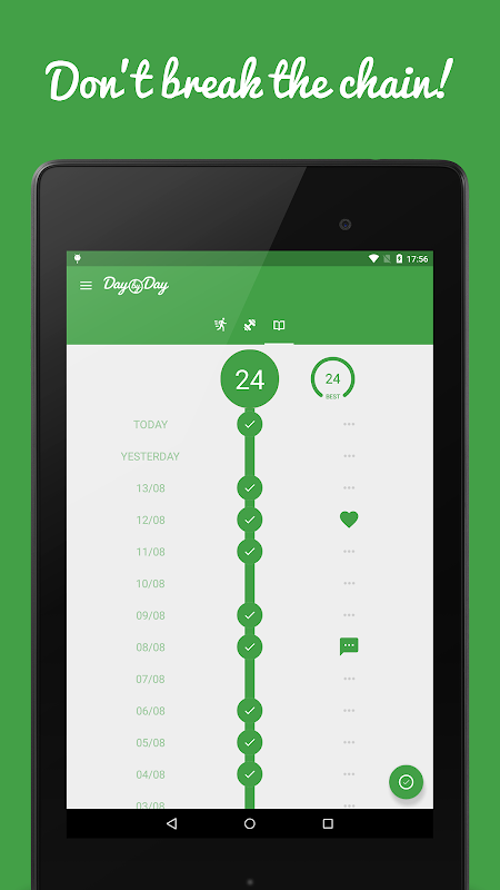 "Day by Day" là một triển khai đẹp đẽ, trau chuốt của phương pháp hiệu ứng "Đừng phá vỡ chuỗi" / X cổ điển để xây dựng và theo dõi thói quen & thiết lập mục tiêu, phá bỏ thói quen xấu và nghiện ngập và vượt qua giải pháp năm mới của bạn!