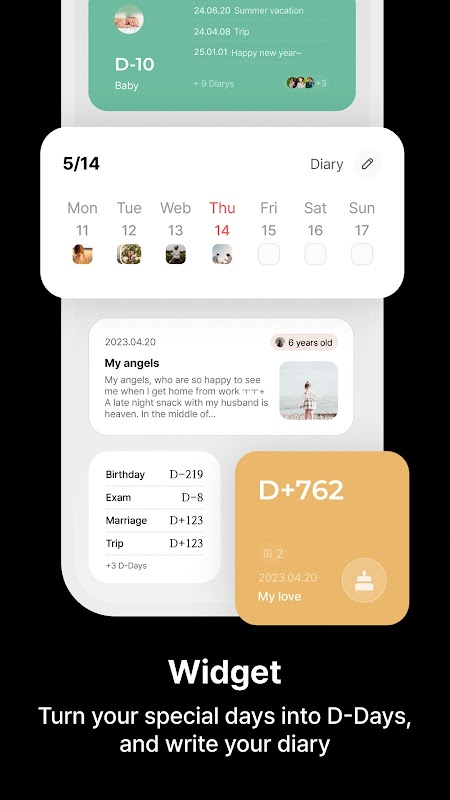 - Utilize a variety of widgets for different purposes, from D-Days to diaries.