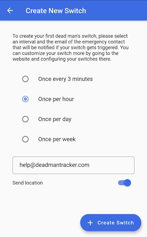 Tạo công tắc chết người tùy chỉnh để gửi thông báo đẩy thẳng đến thiết bị của bạn để kiểm tra xem bạn có ổn không trong khoảng thời gian đều đặn. Nếu bạn không trả lời số điện thoại được yêu cầu thì danh sách liên hệ sẽ tự động được thông báo rằng bạn đã mất tích qua cuộc gọi điện thoại, SMS hoặc email. Bạn thậm chí có thể gửi cho họ những tin nhắn được cá nhân hóa và vị trí đã biết cuối cùng của bạn.