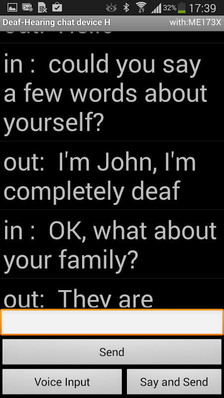 Ứng dụng này cho phép người nghe có thể nhập tin nhắn văn bản trên bàn phím ảo hoặc sử dụng tính năng nhập bằng giọng nói (nút “Nhập bằng giọng nói” hoặc nút “Nói và gửi”). Bạn cần có quyền truy cập Internet để nhập liệu bằng giọng nói. Để gửi tin nhắn đến thiết bị thứ hai, bạn nên bấm nút “Gửi”. Các tin nhắn, nhận được từ thiết bị thứ hai, được hiển thị trên màn hình.