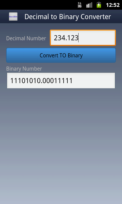 Ứng dụng này chuyển đổi số từ thập phân sang hệ nhị phân. Các ứng dụng có thể bí mật cả hai số nguyên (ví dụ: 121) cũng như phao nổi (Ví dụ: 123,54).