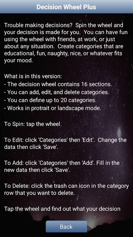 This app was formerly known as "My Decision Wheel" and has been improved with a bigger 16 section wheel. You can also add up to 20 new categories plus edit or delete existing ones. -- Enjoy!