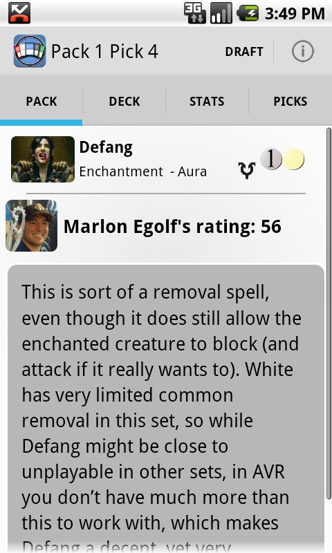 Dự thảo các lựa chọn phải là không bao giờ dễ dàng, nhưng lần đầu tiên bạn không một mình. Marlon Egolf, DraftMagic.com mục và Grand Champion Prix Boston năm 2009, cung cấp một phân tích chiến lược đầy đủ cho mỗi thẻ Magic có trong ứng dụng. Nhà văn khách bao gồm Timothy Landale, Grand Prix Kansas City 2008 Champion và Darwin Kastle, Magic Pro Tour Hall of Famer. Nâng cao kỹ năng chiến lược của bạn với sự giúp đỡ của các xếp hạng thẻ, trong đó cung cấp cho một cái nhìn chi tiết vào mức năng lượng của mỗi thẻ. Xếp hạng của họ chuyên gia cũng được sử dụng để điều chỉnh các AI đối thủ, làm cho trang hoàng Drafter kinh nghiệm gần nhất để thực sự soạn thảo với những thuận, và chiến lược một nguồn lực đáng kinh ngạc.