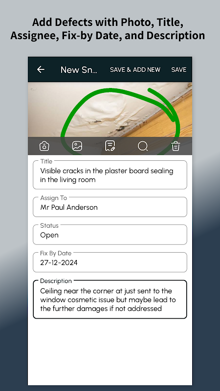 ✔️ Ghi lại lỗi: Ghi lại sự cố bằng ảnh, tiêu đề, người được giao và nhận xét.