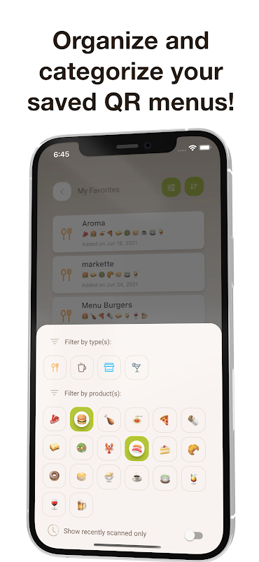 🍔 Sắp xếp các menu yêu thích của bạn bằng cách gắn thẻ chúng bằng các biểu tượng đồ ăn và thức uống, mà sau này bạn có thể sử dụng làm bộ lọc. Bạn cũng có nhiều tùy chọn sắp xếp.
