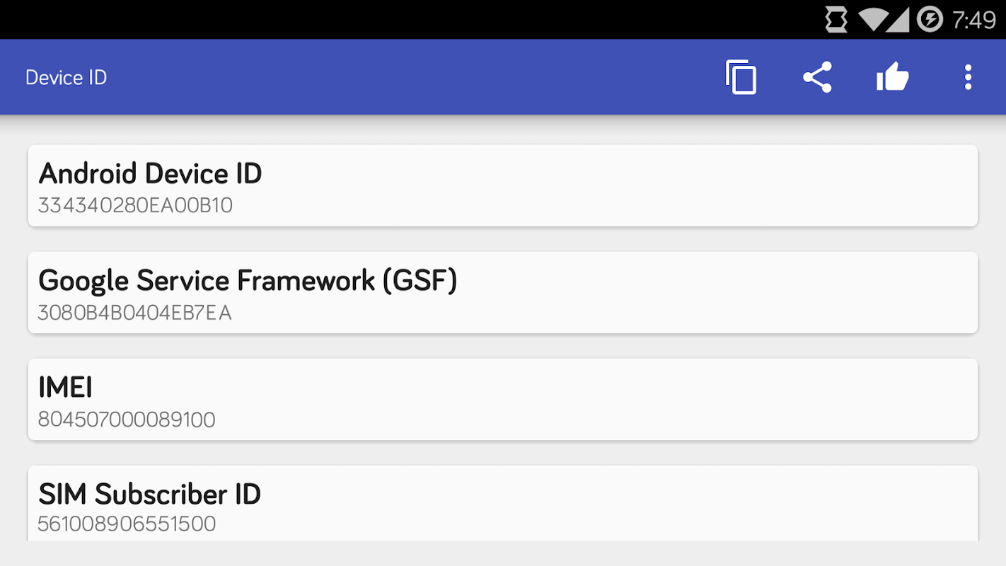 Ứng dụng đơn giản để có được Device Info / ID / local địa chỉ IP / MAC của bạn và nối tiếp cho phép bạn dễ dàng sao chép và chia sẻ các ID của thiết bị di động của bạn.