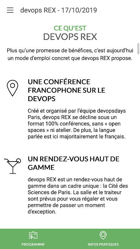 devops REX est un rendez-vous haut de gamme dans un cadre unique : la Cité des Sciences de Paris. La salle et le traiteur sont prévus pour vous régaler et vous permettre de passer un moment d'exception.