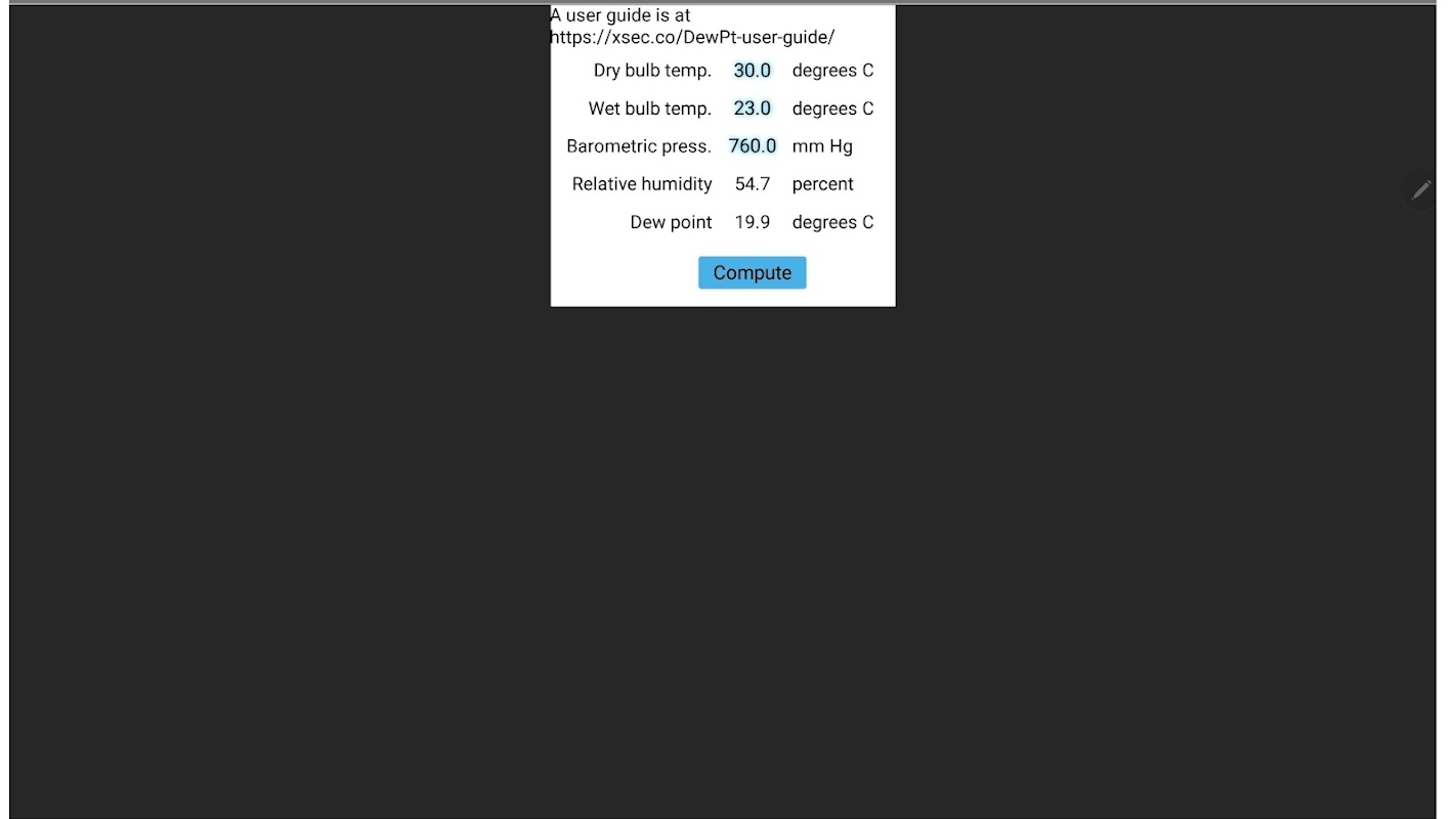 Ứng dụng này tính toán nhiệt độ điểm sương và độ ẩm tương đối từ nhiệt độ bầu ướt, nhiệt độ bầu khô và áp suất khí quyển đầu vào. Nếu không có áp kế, ước tính 760 mm thủy ngân thường sẽ cho kết quả gần đúng. Nhiệt độ tính bằng độ C và áp suất khí quyển tính bằng mm thủy ngân.