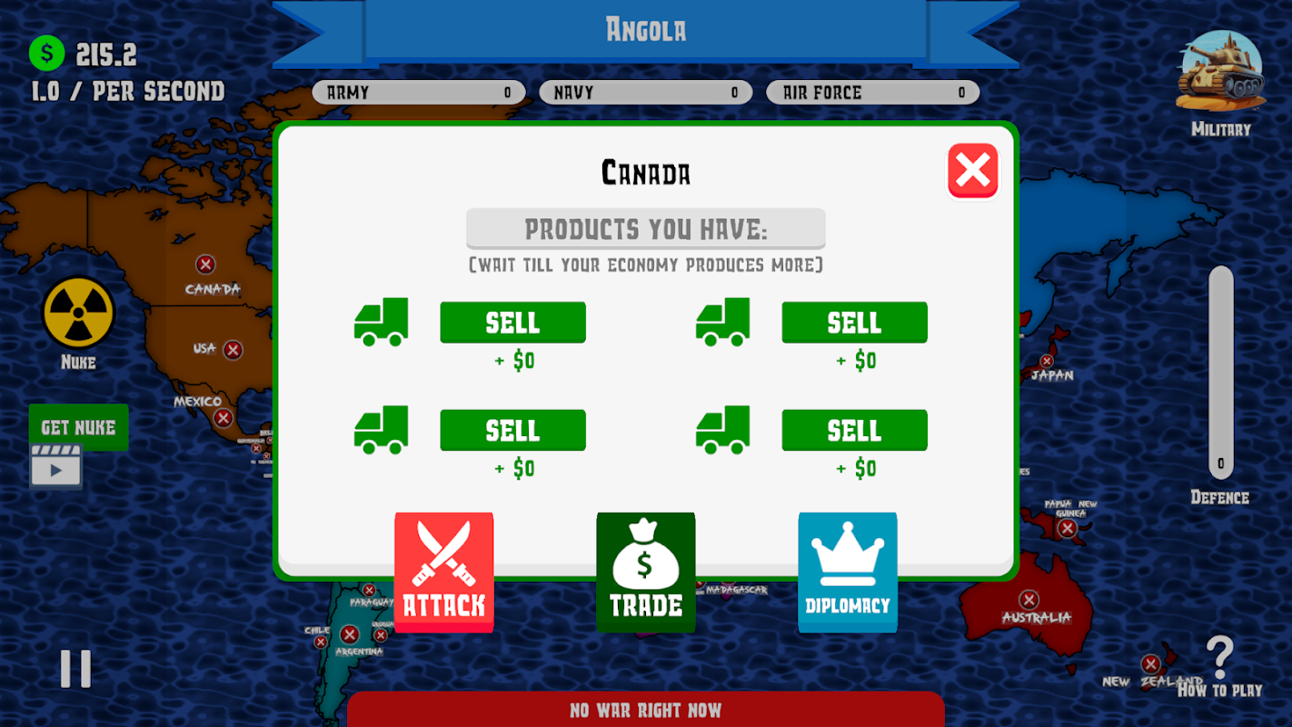 Hành tinh được chia thành 5 khu vực khác nhau, mục tiêu của bạn là chinh phục các quốc gia, biến sản xuất của họ thành lợi ích cho quân đội của bạn và sử dụng chúng để chinh phục nhiều vùng lãnh thổ hơn! Cách duy nhất để làm được điều đó là nâng cấp quân đội của bạn theo 3 cách khác nhau: quân đội, hải quân và không quân. 💥💥