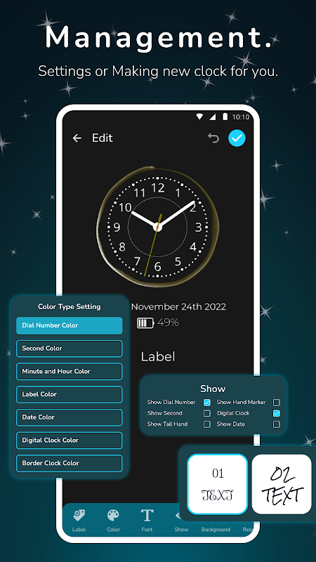 - Dễ dàng và tùy chỉnh trang trí màn hình điện thoại bằng đồng hồ ngày giờ kỹ thuật số.