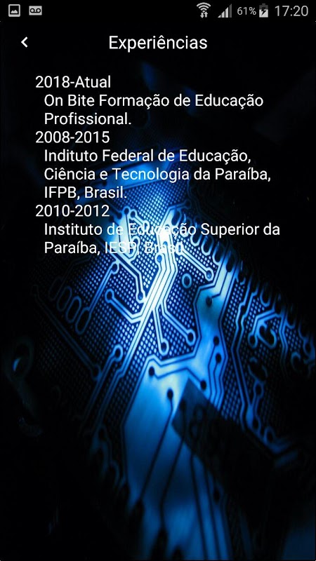 Bằng trong các hệ thống viễn thông từ Viện giáo dục đại học của Paraiba (2007). Hành động theo các chủ đề sau: mạng máy tính, hệ thống cáp cấu trúc, robot, vi điều khiển và kiến thức Olympic.