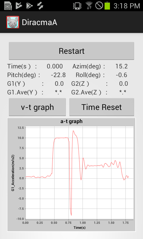 Khi ứng dụng được khởi động, ứng dụng sẽ đo các thay đổi gia tốc theo hướng trục Y của điện thoại thông minh (hướng dọc) và hướng trục Z (hướng dọc đến màn hình) và tạo biểu đồ thời gian tăng tốc (biểu đồ a-t). Ngoài ra, khởi động lại đo bắt đầu.