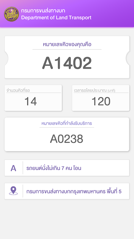 แอพพลิเคชั่นคิวอัตโนมัติของกรมการขนส่งทางบก ใช้สำหรับการรับคิว ดูคิว การจองคิว และการประชาสัมพันธ์