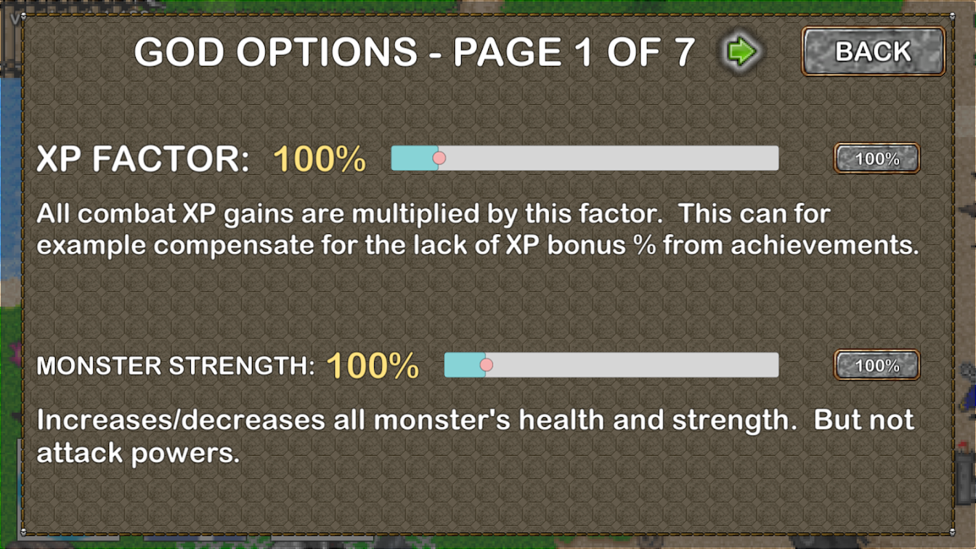 - thanh trượt để tăng số lượng chiến lợi phẩm ngẫu nhiên từ 100% lên đến 500% (chỉ ảnh hưởng đến những vật phẩm rơi không cụ thể từ quái vật, rương và tìm thấy)