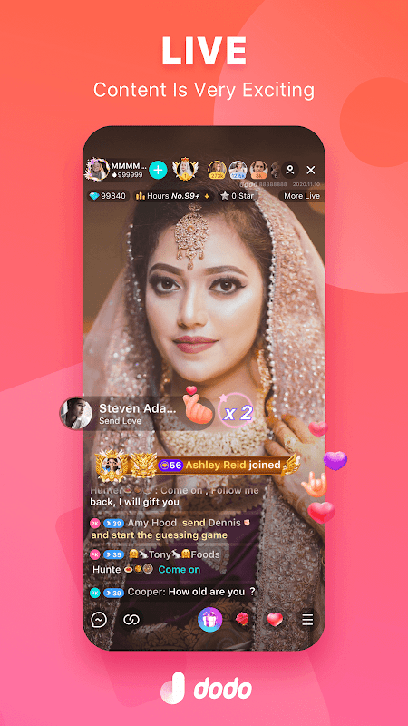 Trò chuyện Dodo là một nền tảng xã hội tích hợp phát trực tiếp, trò chơi và phòng thoại. Tại đây, bạn có thể xem các chương trình phát sóng trực tiếp tài năng, chơi các trò chơi Ludo thư giãn và vui vẻ, đồng thời kết bạn mới chân thành và thân thiện trong phòng thoại.