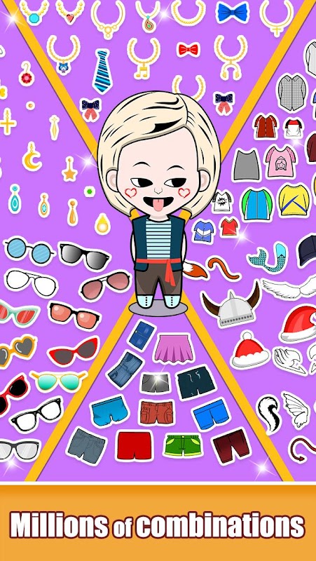 Lựa chọn từ nhiều tùy chọn. "Tạo phong cách cho búp bê" của bạn với quần áo và biểu cảm dễ thương & "đáng yêu". Tóc giả, áo sơ mi, áo khoác, áo cánh, váy, giày và nhiều vật phẩm khác để làm phụ kiện. Kết hợp nhiều vật phẩm khác nhau để hoàn thiện "búp bê thời trang" của riêng bạn. Tạo nhân vật "cô gái dễ thương" và "cậu bé đẹp trai" của riêng bạn.