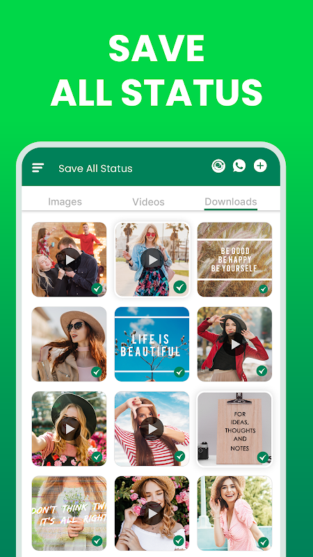 Trạng thái video rất dễ dàng và hữu ích để lưu trạng thái ảnh và video bất cứ lúc nào. Bạn có thể lưu hình ảnh trong thư viện di động của mình và có thể sử dụng lại chúng cho trạng thái của mình trong tương lai. Tạo DP: Lưu tất cả trạng thái hữu ích cho danh bạ di động của bạn và sử dụng lại trạng thái này bao lâu tùy thích. Lưu tất cả trạng thái - ứng dụng trạng thái ảnh tải xuống tất cả video, hình ảnh và ảnh của bạn bè của bạn và bạn có thể chia sẻ chúng với bạn bè của mình bất kỳ lúc nào.