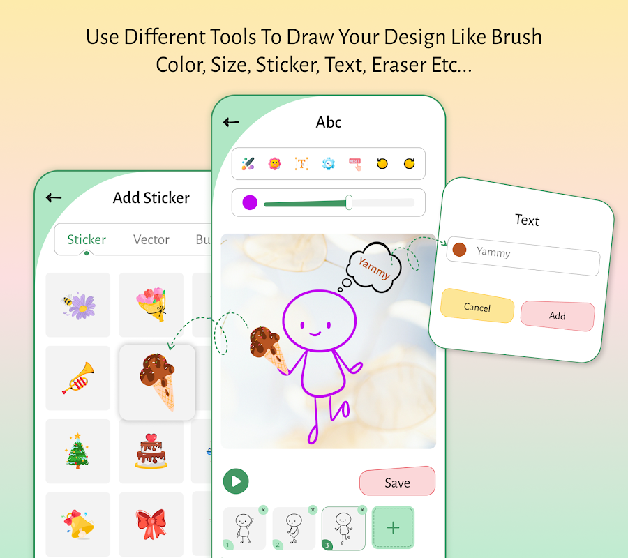 Draw Animation Sketch có nhiều lựa chọn công cụ chỉnh sửa như bút chì với kích thước, văn bản, hình dạng, nhãn dán.