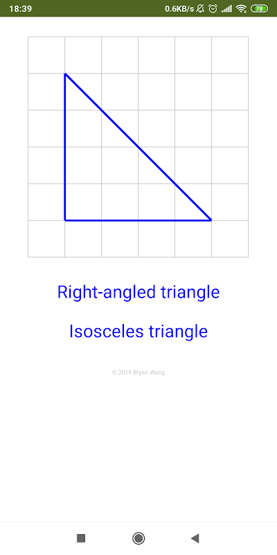The app allows you to drag corner to draw different triangles on squared paper. Based on the triangle made, two names of the triangle will be displayed. One based on its sides, and the other one is based on its angles.