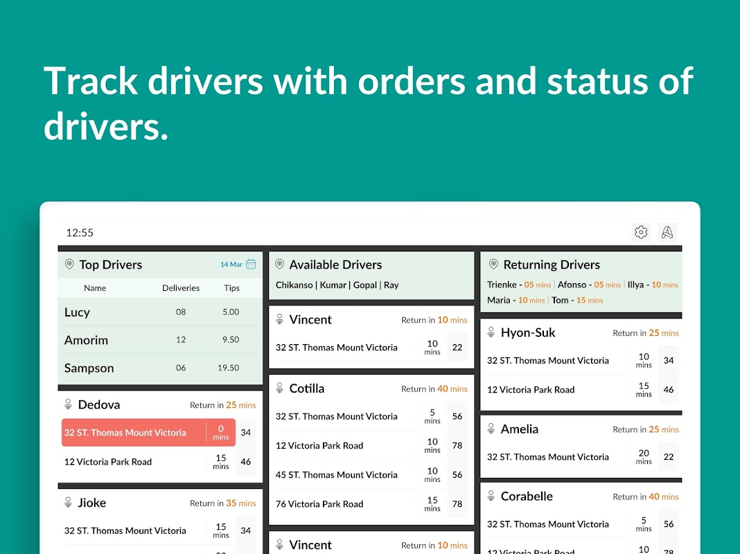 Nếu tài xế hiện được chỉ định giao hàng, trạng thái tài xế có thể hiển thị thông tin chi tiết về nhiệm vụ, bao gồm điểm đến, thời gian đến dự kiến. Để đánh giá hiệu suất của tài xế, chế độ xem trạng thái có thể bao gồm các số liệu như trạng thái giao hàng của tài xế hàng đầu và tiền boa mà tài xế kiếm được.