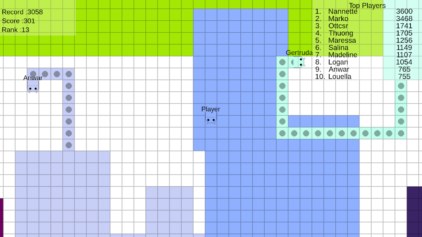 Players control their slither snakes to encircle parts of the grid, then the blocks will be captured and become the same color as the snake. You must avoid other players to hit the tail of your snake, and you can kill other snakes by hit their tails with your snake's head, you will earn extra 50 points for each defeat enemies by hit their trails.