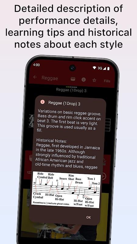 - Âm thanh chất lượng cao được tạo từ các mẫu trống thực tế, lặp lại để luyện tập theo.