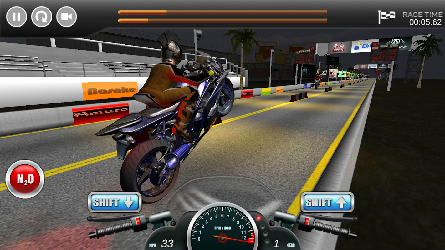 Become the best in this ultimate drag racing competition. Start with a basic racing bike and upgrade it as you earn enough cash from your rivals. Win races in order to reach and attempt to defeat the bosses. Ultimate goal is to get the ROCKET FAST JET BIKES which are required for MULTI-PLAYER races. Win races and collect RW points to become the DSE leaderboard racing champ. Modifications and upgrades will result in your winning success. Detail any racing bike with your exclusive taste in colours. Our UNIQUE COLOUR BARS in the customize section of DSE Racing make this game like no other.