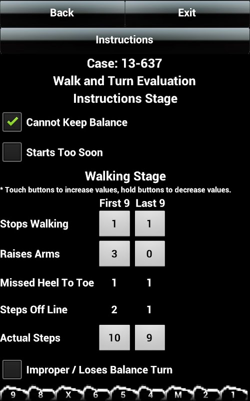 This is a beta version of DUI SFST Pocket Guide Free. This app will be free and ad free for use by Police Officers who investigate DUI's/DWI's using Standardized Field Sobriety Testing. This app has the following screens: Subject Information, Vehicle In Motion Cues, Personal Contact Cues, Horizontal Gaze Nystagmus Score Sheet, Walk and Turn Score Sheet, One Leg Stand Score Sheet, Finger To nose Score Sheet, all with instructions. There is also Implied Consent (Florida Only for now). All SFST's are based and score on NHTSA standards. We are looking for feedback. Send us an email if you have any suggestions, comments, or bug reports.
