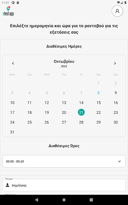 Η εφαρμογή e-test app παρέχει στο χρήστη τη δυνατότητα να εξοικονομήσει χρόνο, παρακάμπτοντας τη διαδικασία καταχώρισης στοιχείων και πληρωμής στην υποδοχή, αφού τα στοιχεία του έχουν σταλεί ηλεκτρονικά και η πληρωμή των εξετάσεων έγινε μέσω της κάρτας του.
